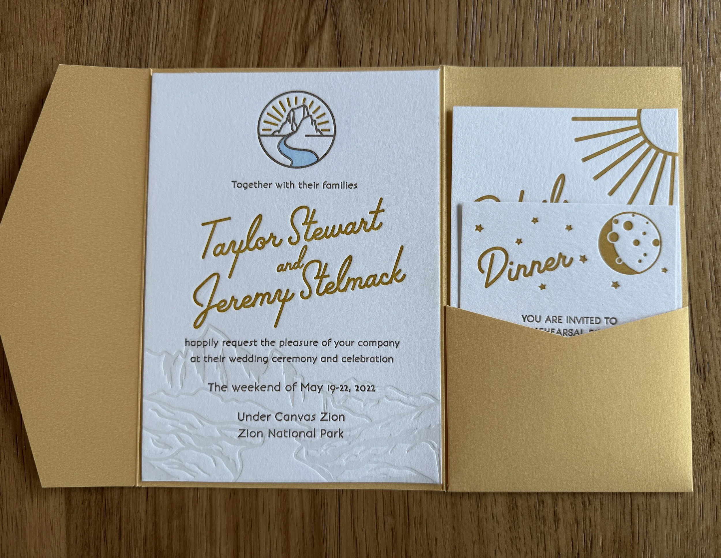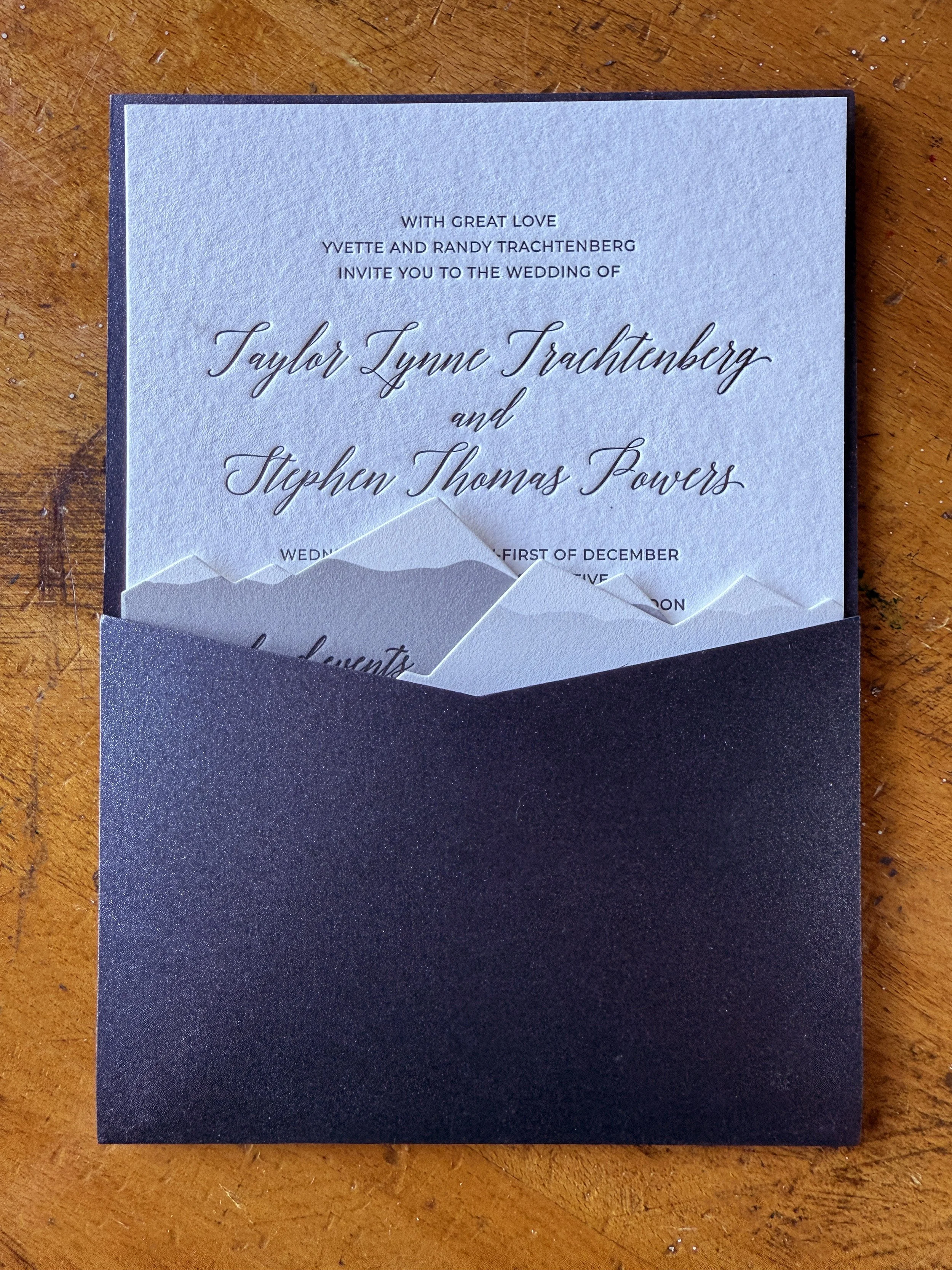 Presentation folder - invite is adhered to folder, inserts are tucked into the side pocket